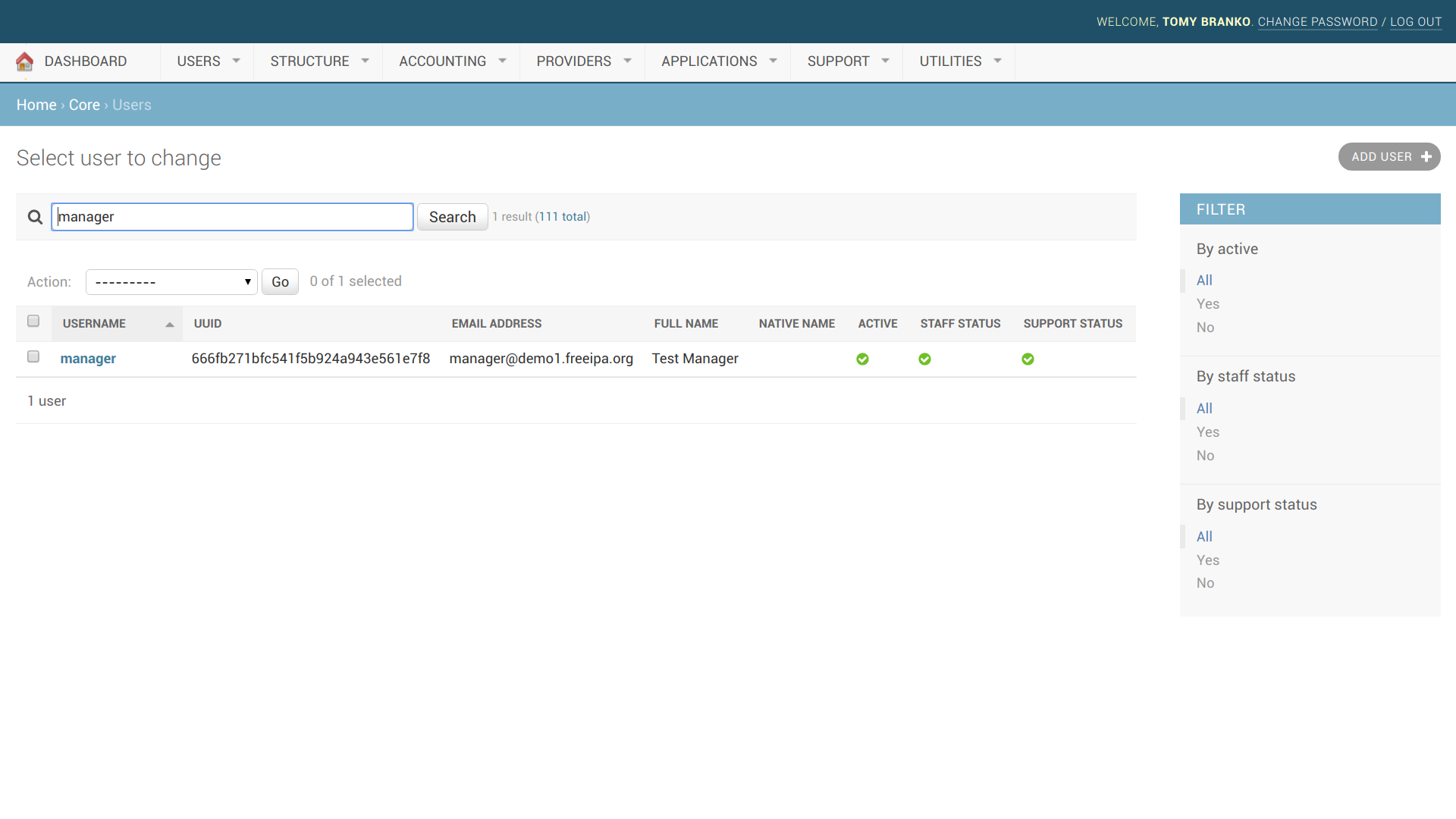 2. If user is assigned to admins group in LDAP, he becomes staff in Waldur. If user is assigned to support group in LDAP, he becomes support user in Waldur. For example, consider the manager user which belong to both groups: