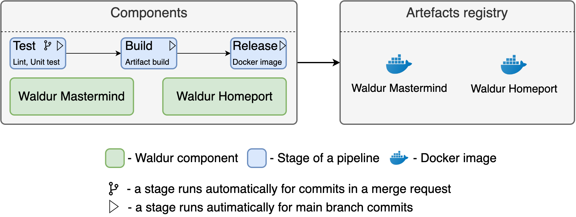 Waldur uses CI/CD approach for testing, packaging and deployment. The approach is implemented with GitLab CI system. It provides a framework for building pipelines. A pipeline consists of a sequence of stages, each of which depends on the result of a predecessor and includes smaller parts called jobs. A job is a sequence of actions executed for a specific purpose, e.g., testing an application.