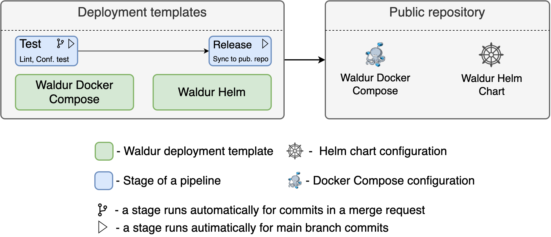 Waldur deployment templates are the configurations for different deployment environments. Currently, Waldur supports Docker Compose and Kubernetes. The structure of the latter one is based on Helm technology. The pipeline is shown below.