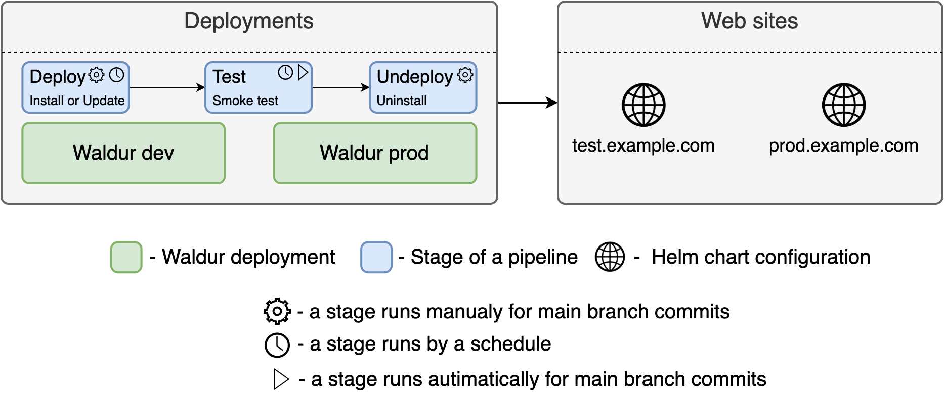 - Deploy, where Waldur release is installed or updated. This stage runs only for main branch commits. For Docker Compose environment, this stage is triggered automatically. For Kubernetes, it runs automatically only for update operations, while installation requires a manual trigger. Also, the update action runs by a schedule, e.g. at 5 AM;