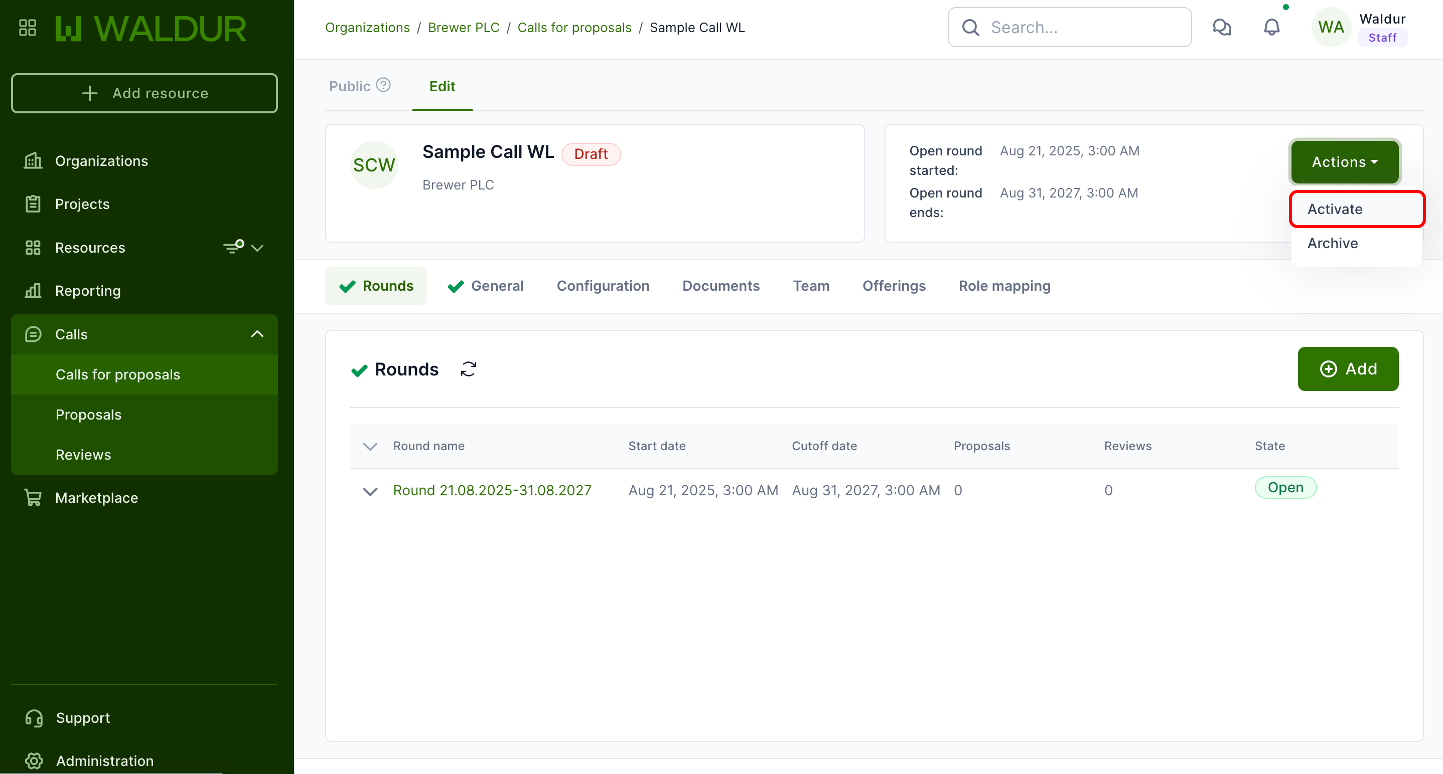 This guide walks you through the entire lifecycle of call management in Waldur, from setup to final resource allocation. It is structured in a step-by-step format to help each stakeholder understand their responsibilities in the process.