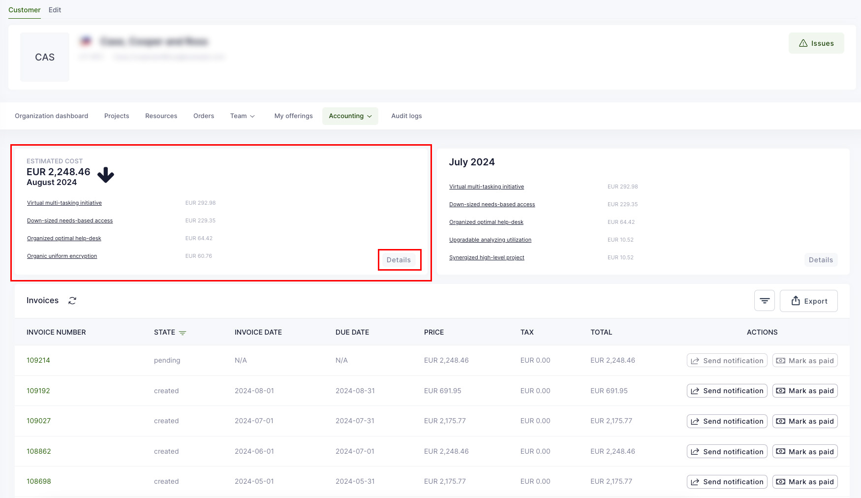 Estimated cost of a running month can be seen from the same view as invoices. By default, it shows top 4 projects with the highest cost. By clicking “Details”, you are able to see all projects with estimated costs.