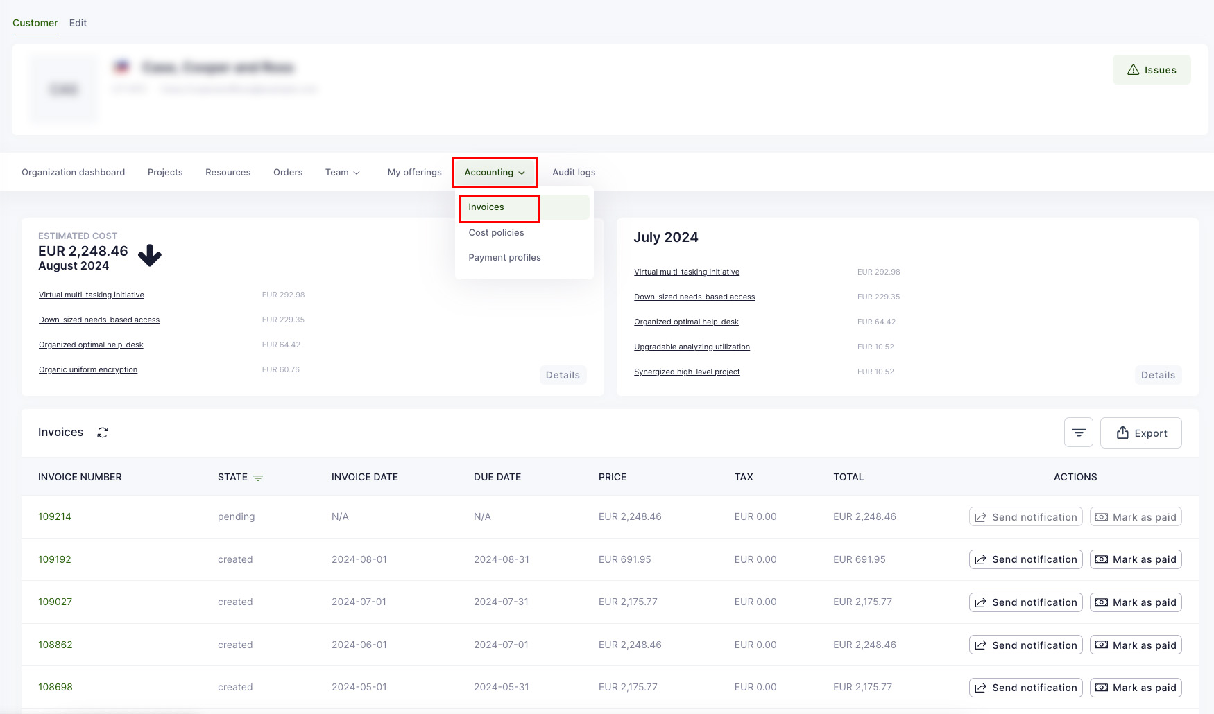 Waldur provides a convenient way to see the invoices issued to the organization. Open the organization dashboard and select “Accounting” from the top menu and then “Invoices”. Now you’re able to see all invoices issued to the organization.