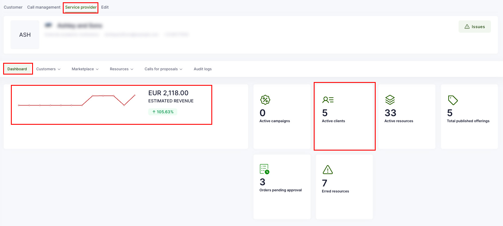 If the organization is service provider, then it is possible to check the amount of revenue of a running month. To do that, open the organization dashboard, choose "Service provider" view and then dashboard opens. There you will see the total amount of estimated revenue and also 11 previous months.