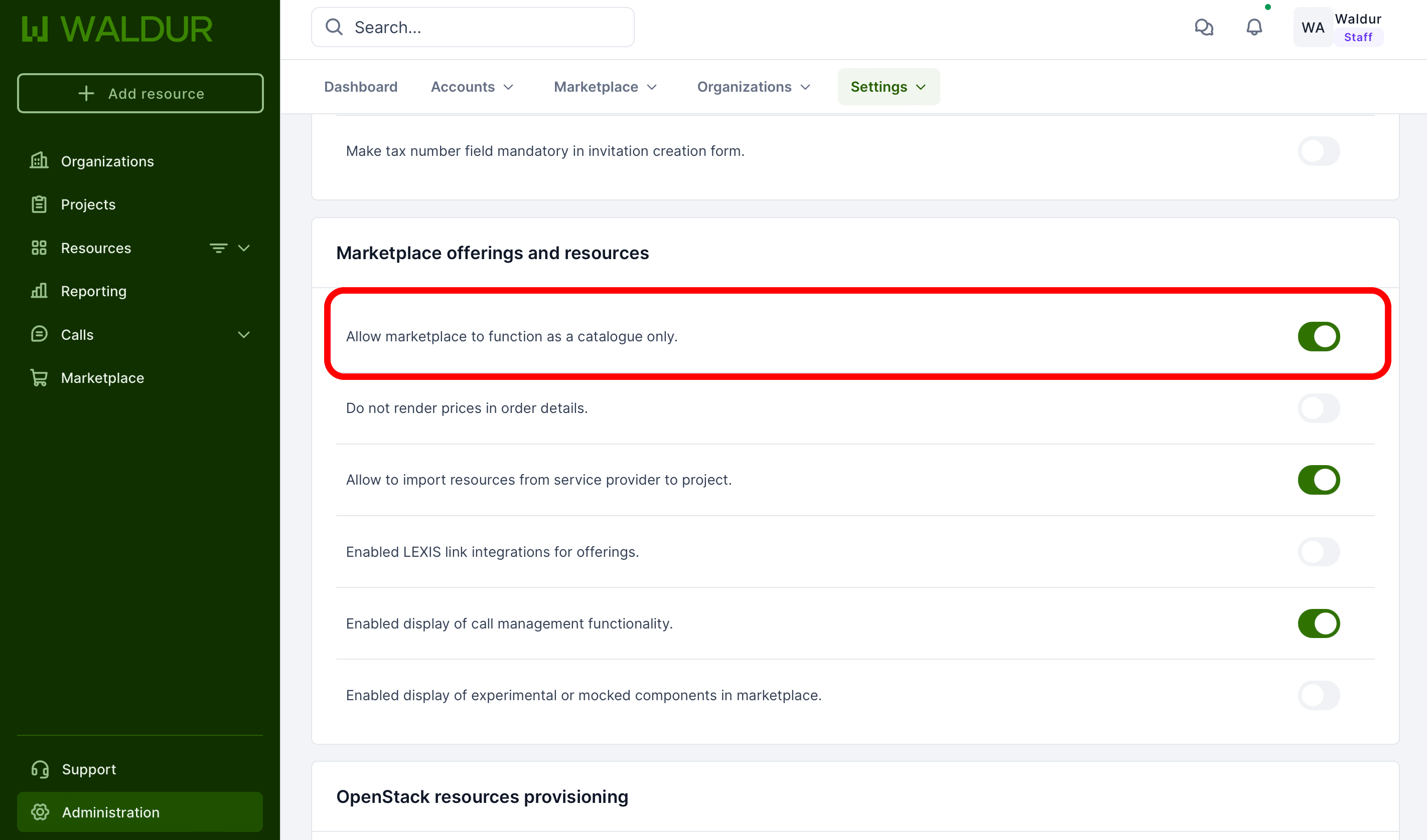 This guide explains how to enable and use the Catalogue mode in Waldur. This feature changes the marketplace to a catalog-only view, where services are displayed as a list of offerings but cannot be ordered directly through the platform.