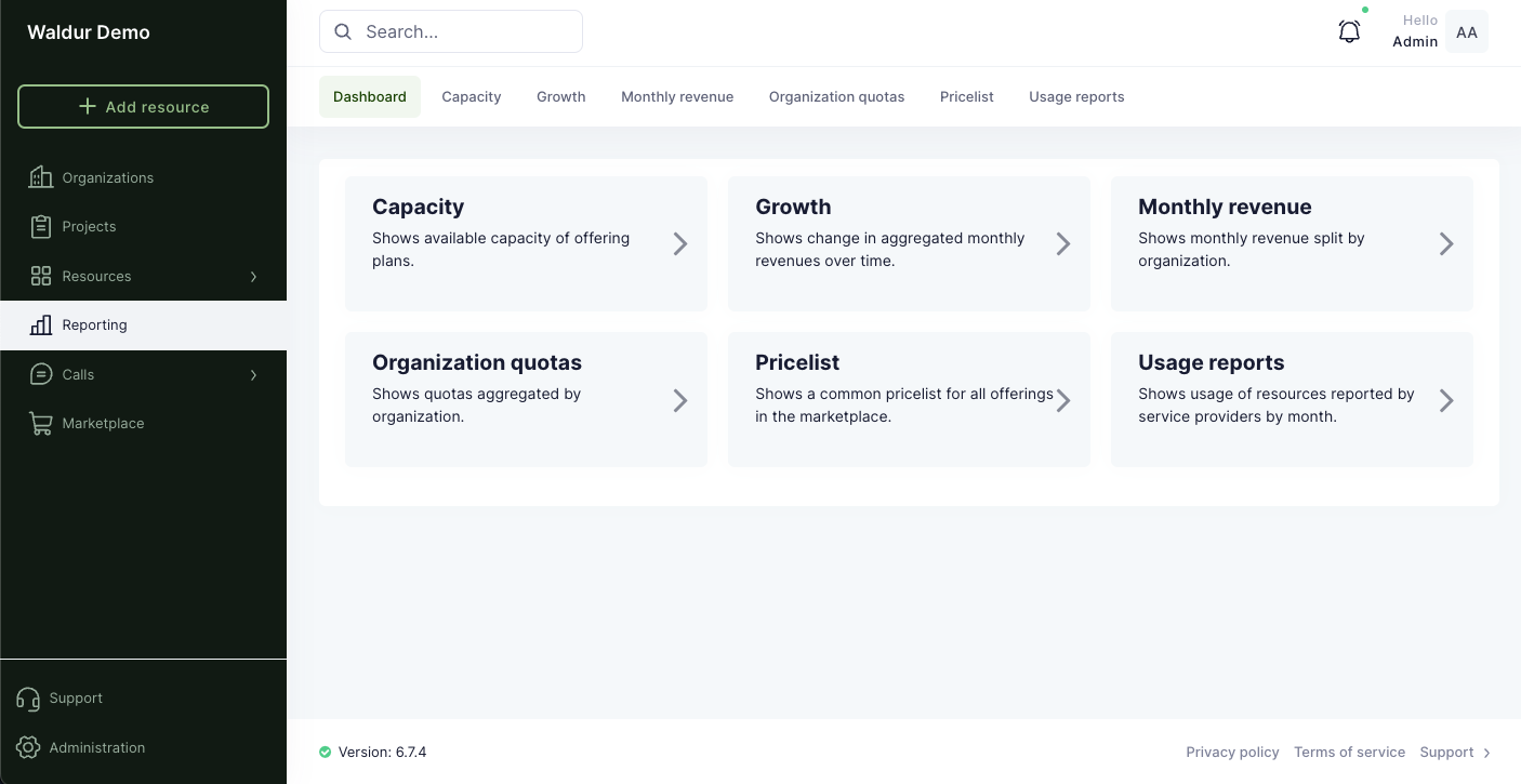 Waldur HomePort includes a number of built-in reports based on the user activity. Reports can be accessed by staff and support users from the "Reporting" sidebar menu.