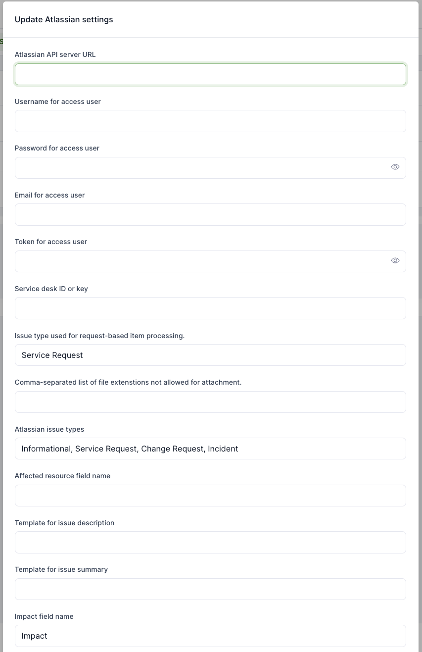 - Atlassian API server URL – The base URL for connecting to the Atlassian API.