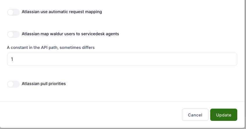 - Atlassian map Waldur users to service desk agents – This suggests an integration between Waldur and Atlassian's service desk. Enabling this would map Waldur users to service desk agent roles.