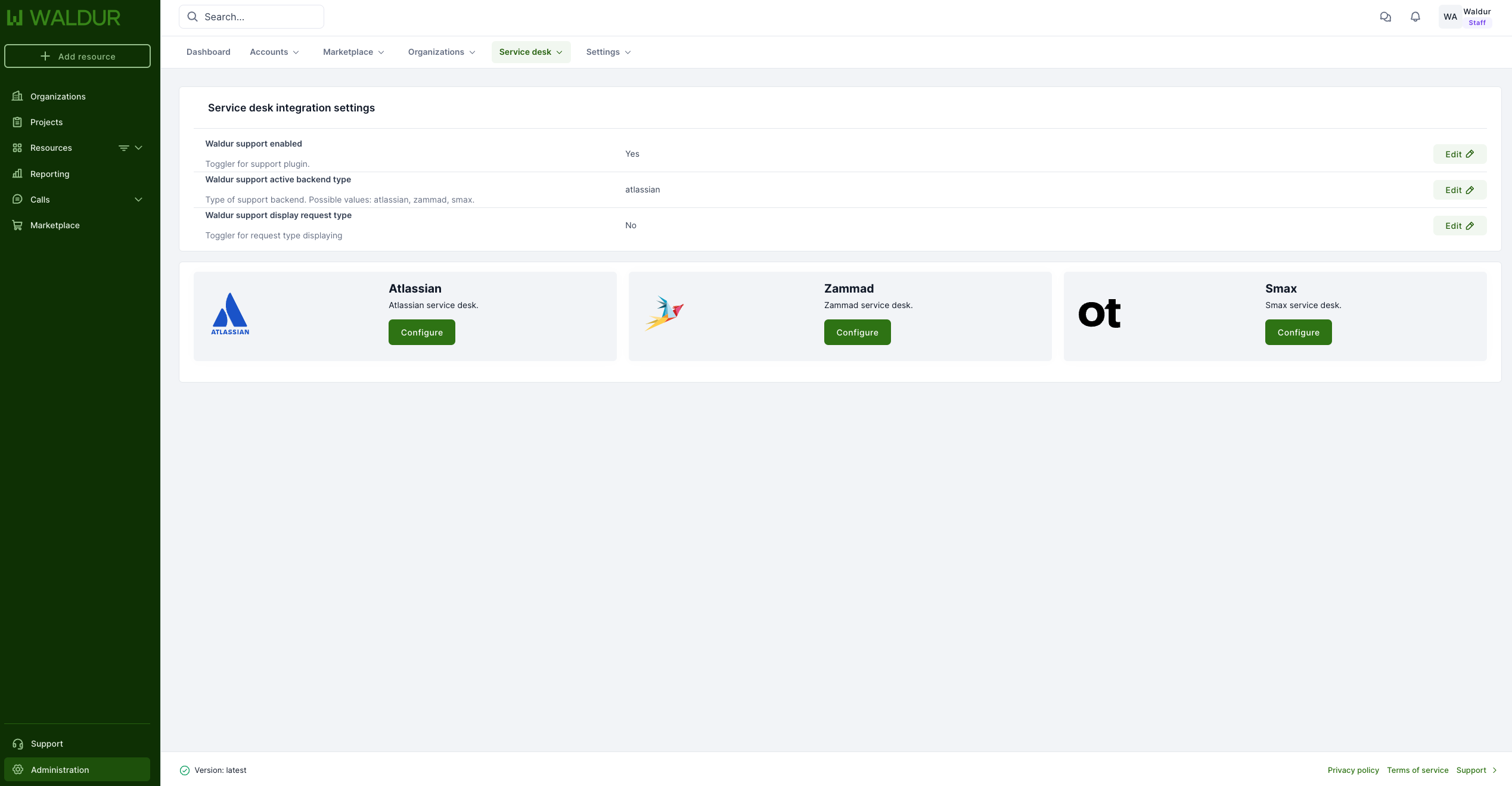 To configure Atlassian for Waldur, open the Service Desk configuration page and select Configure from the Atlassian box.