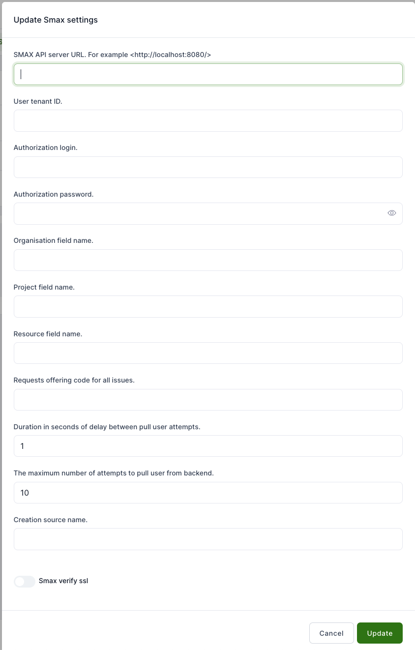 - Smax verify ssl - Toggle this setting to enable or disable SSL verification when communicating with the SMAX server.