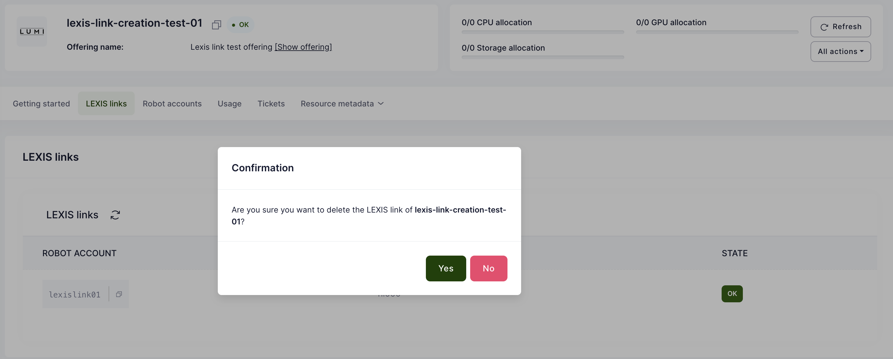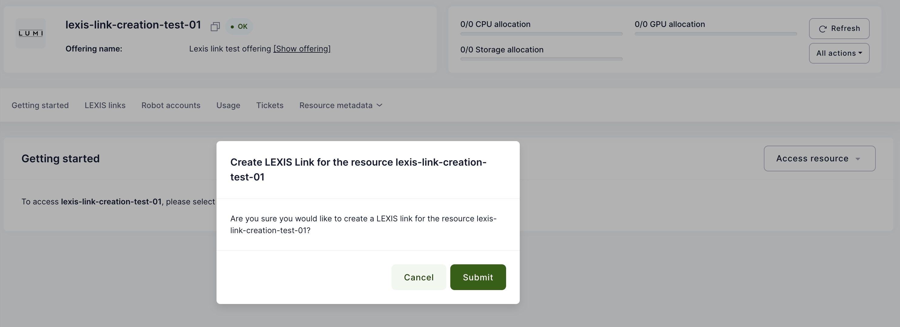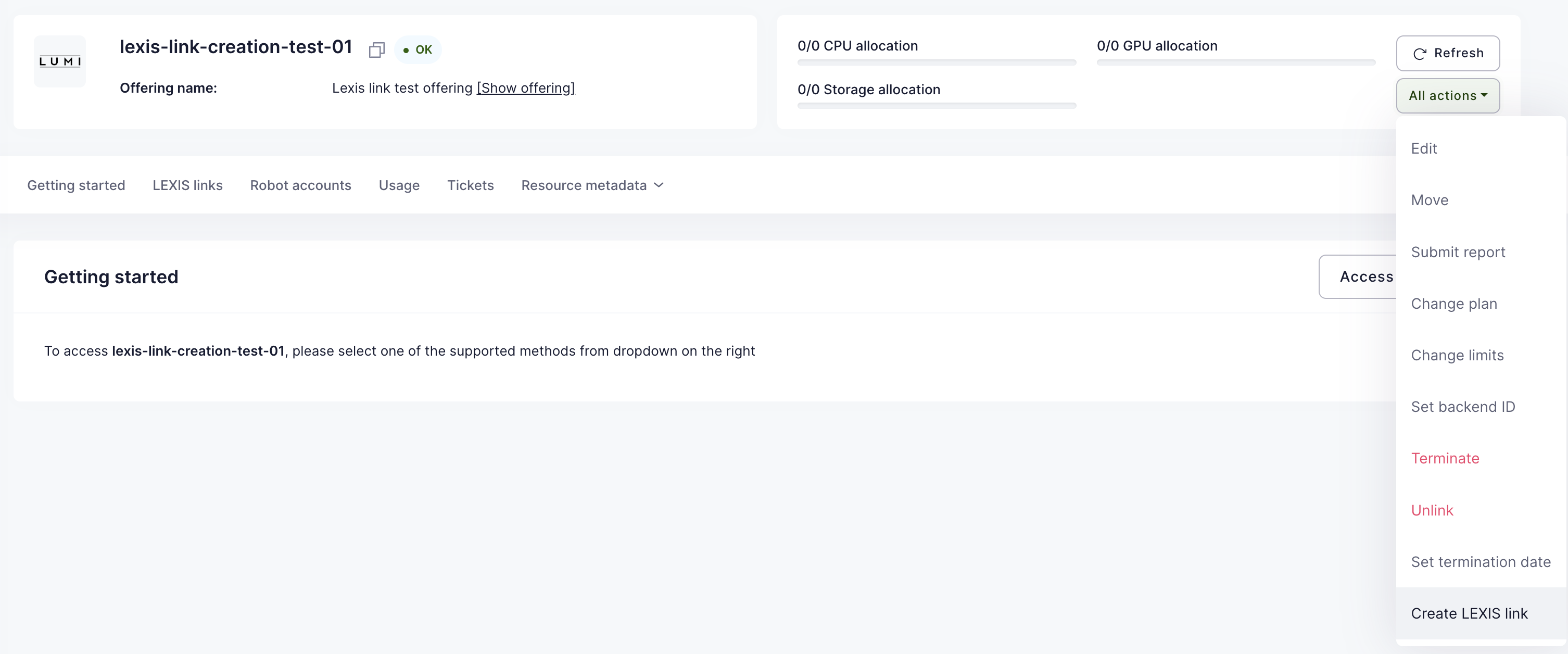 Note: To be able to create a LEXIS link for a resource using Waldur UI: