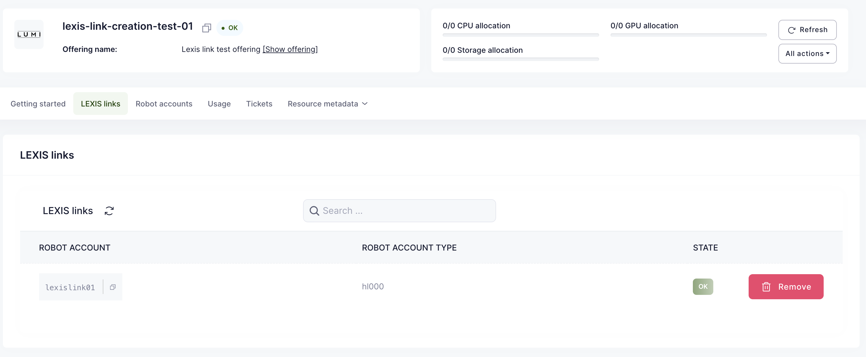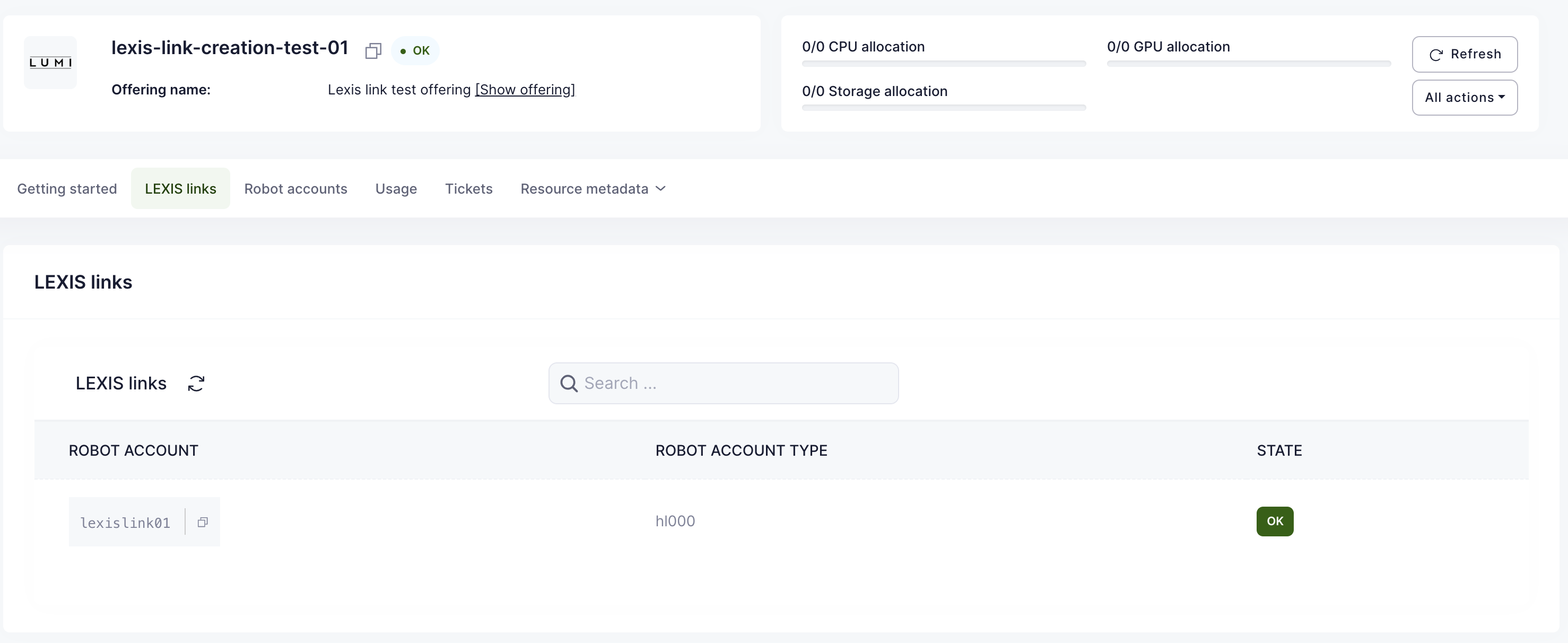 Listing LEXIS links can alternatively be done through Waldur UI by visiting resource details