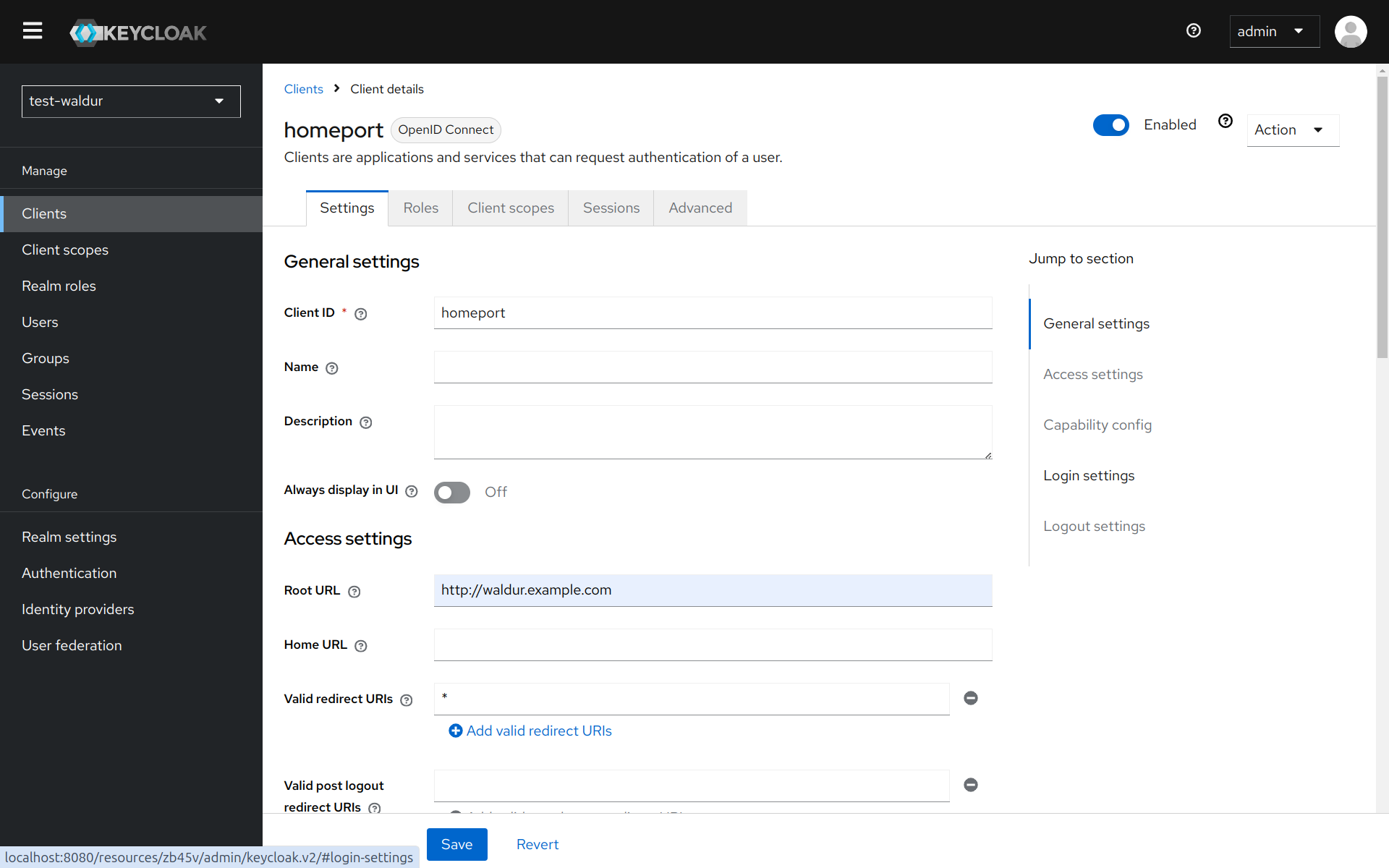 6. Change client's Valid redirect URIs to "*". Valid redirect URIs