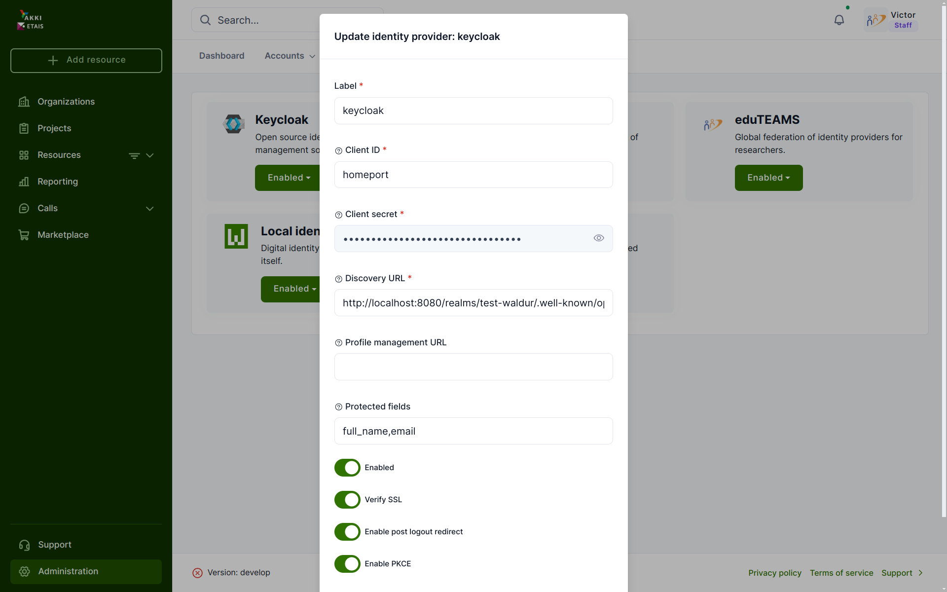 Identity providers 3. Open Keycloak identity provider details by clicking on Edit menu of Keycloak dropdown menu HomePort provider details 4. Copy Client ID, Client secret and Discovery URL. For extra security, enable SSL, PKCE and post-logout redirect.