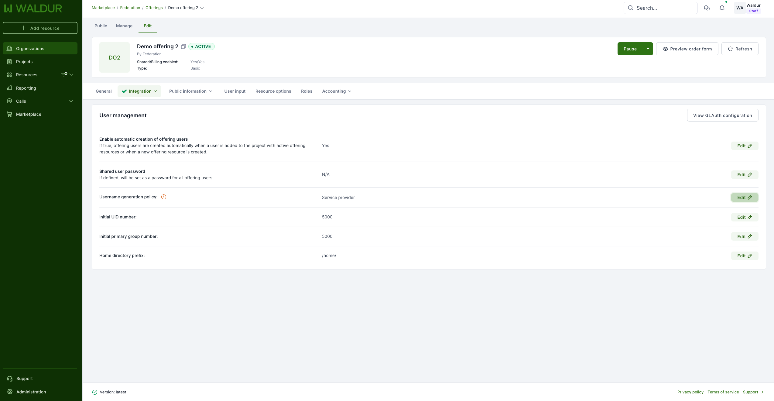 OfferingUser is a model in Waldur, which represents a link between an offering available in marketplace and a user. A service provider can utilize it to create an account for a service visible for all the offering resources, for example: a user account in a SLURM cluster. As an account, an OfferingUser can have a custom username different from user's one.