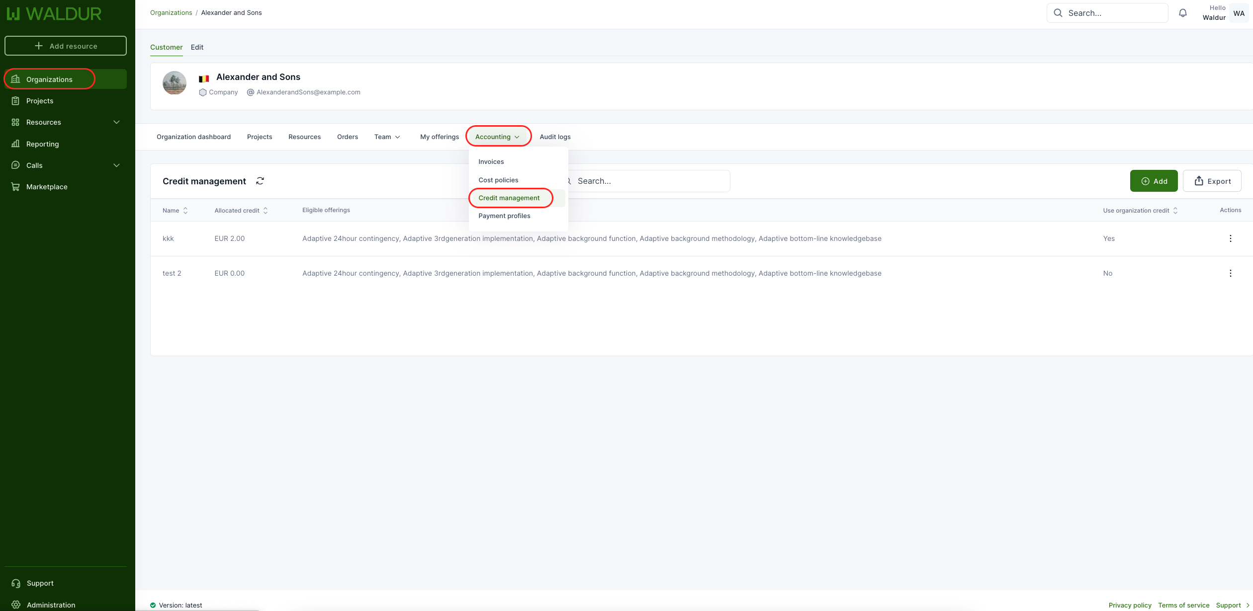 To see current credit management policies, open the organization dashboard and then Accounting -> Credit management from the top menu.