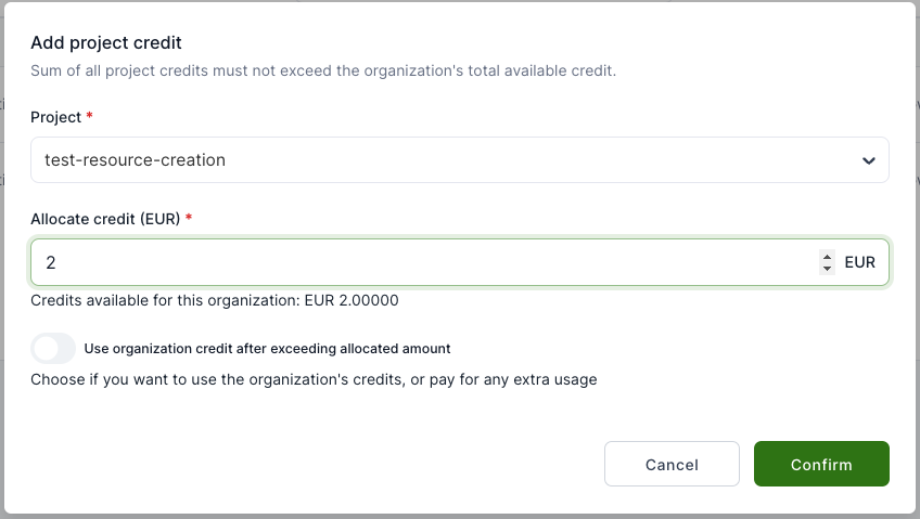 - Use organization credit after exceeding allocated amount - Enable, if project can use organization credits after running out of project credits. If disabled, resource usage will be invoiced according to the pricing plan.