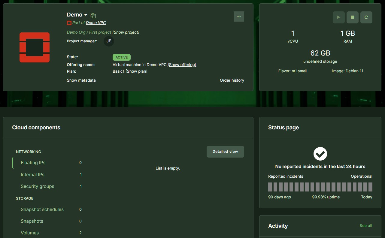 • By default, no incoming connections will be allowed for a VM. Predefined Security Groups (firewall rules) must be linked to a VM in order to open up access (like ssh, HTTP, etc.). By clicking the ’Details’ button, you can see the details about the available ’Security Groups’. ’Security Groups’ can be added while ordering the VM or afterward by editing.