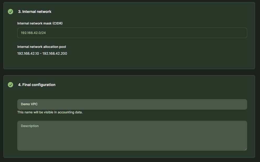 • VM needs to be connected to at least one of the VPC (internal) networks and an external network via floating IP - if external/public access to VM is required.