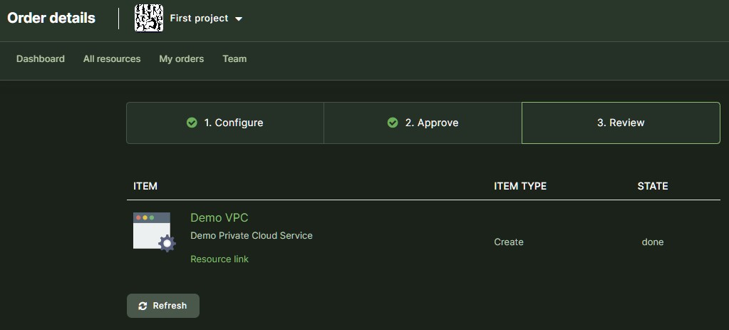 b) If your role is ´Organization Owner´ you are able to complete the purchase to final approval (click the ´Purchase´ button). Hereafter the system will need a couple of minutes to execute the order. Once the system changes the state to ´Done´, your VPC is ready to use.