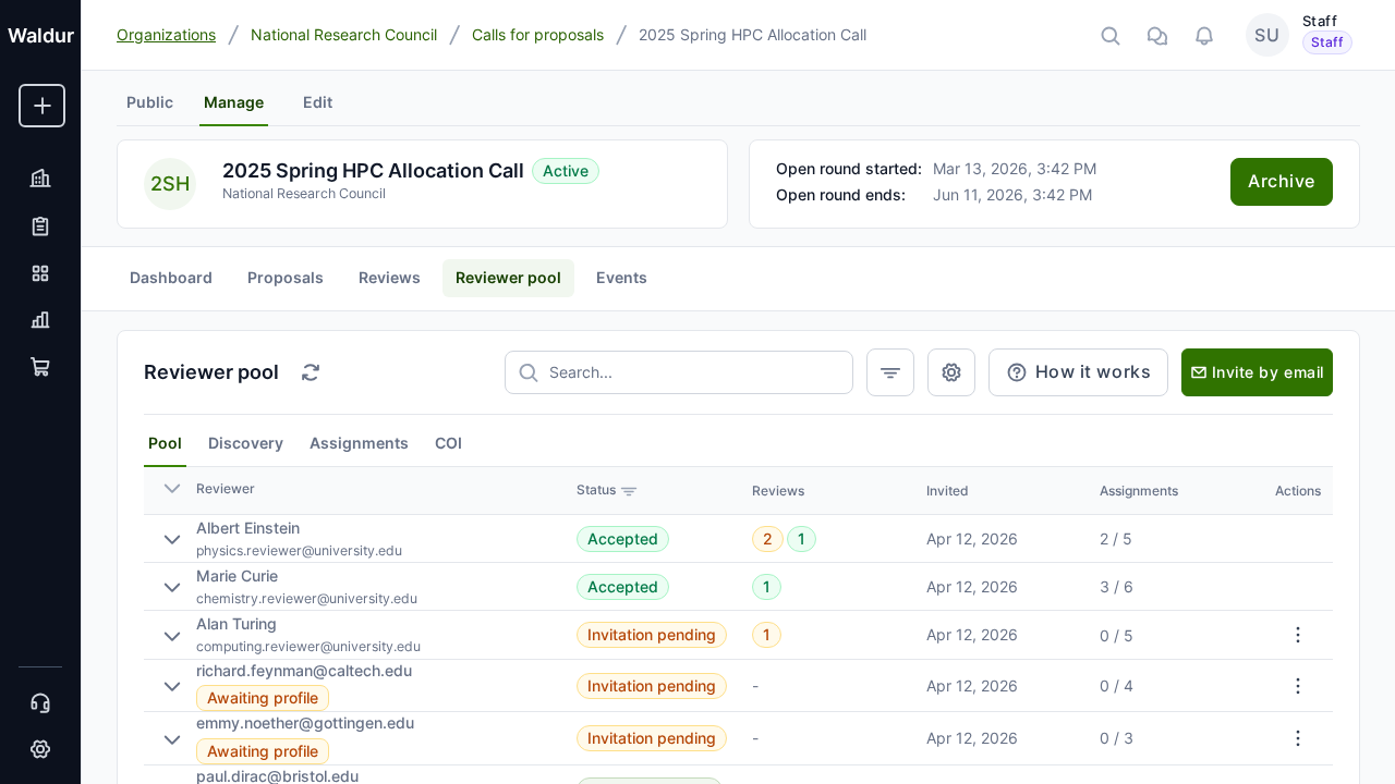 This guide covers the complete reviewer lifecycle in Waldur's call management system: building reviewer pools, managing reviewer profiles, configuring reviewer-proposal matching, and handling conflicts of interest.