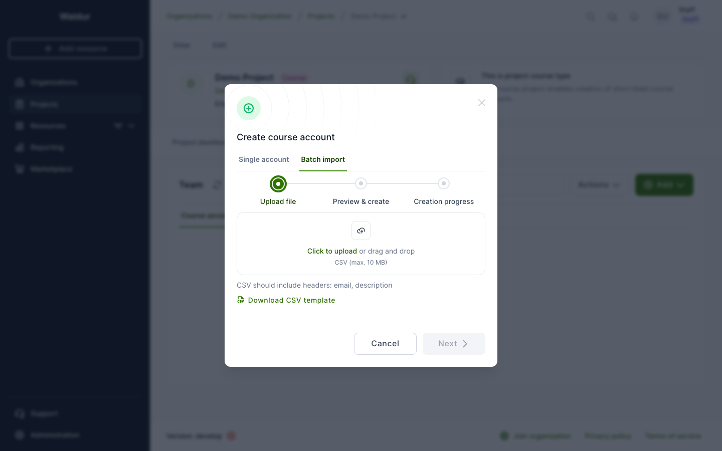 For courses with many participants, use the batch import feature to create multiple accounts at once from a CSV file.