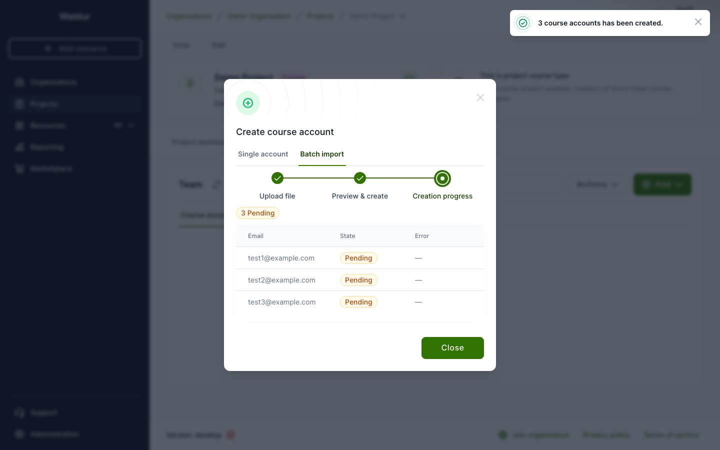 Course accounts allow project managers to create temporary user accounts for course participants. Waldur supports both individual account creation and bulk import via CSV.