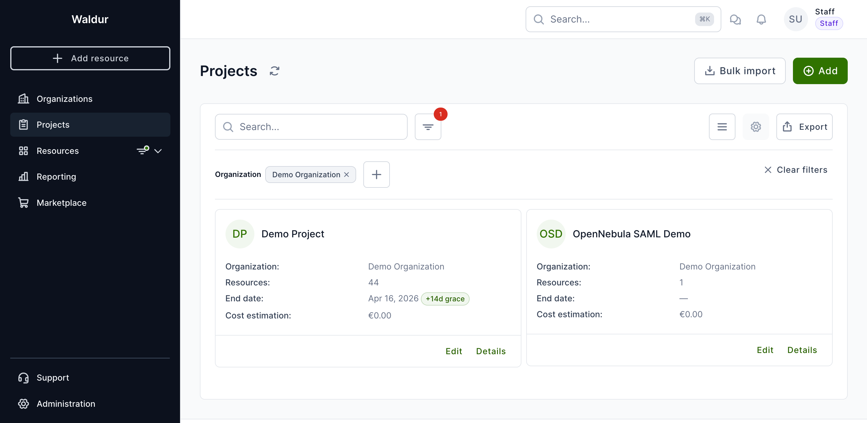 - End date – once reached (plus any configured grace period), triggers the creation of termination orders for the existing resources. If the resources have already been terminated by this time, the project will be removed. The date is inclusive.