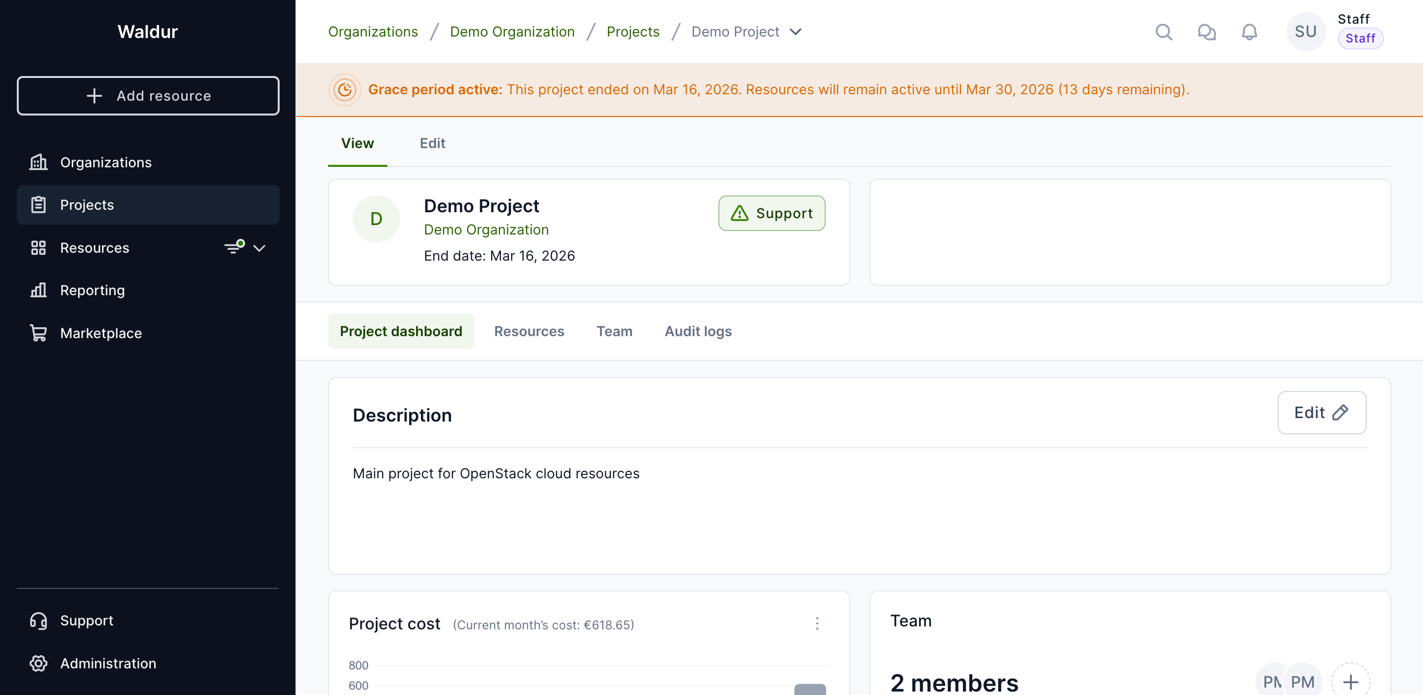 - When the project's end date has passed but the grace period is still active, an "In grace period" badge appears.