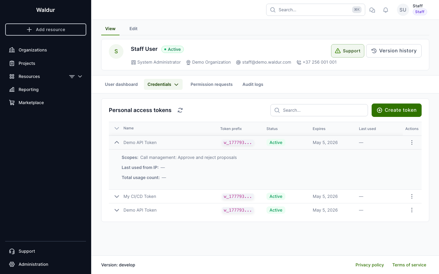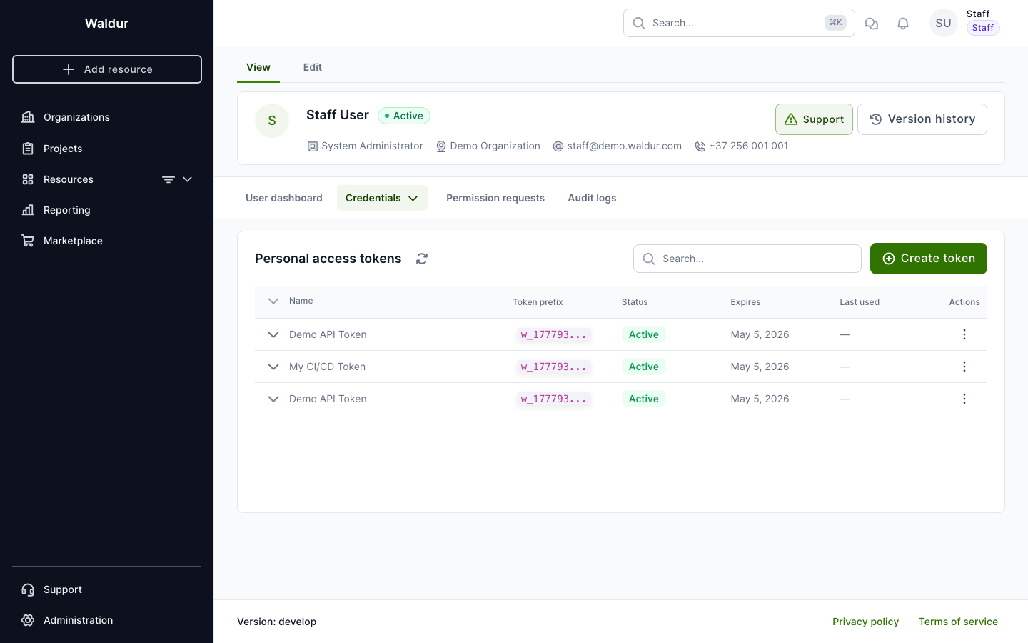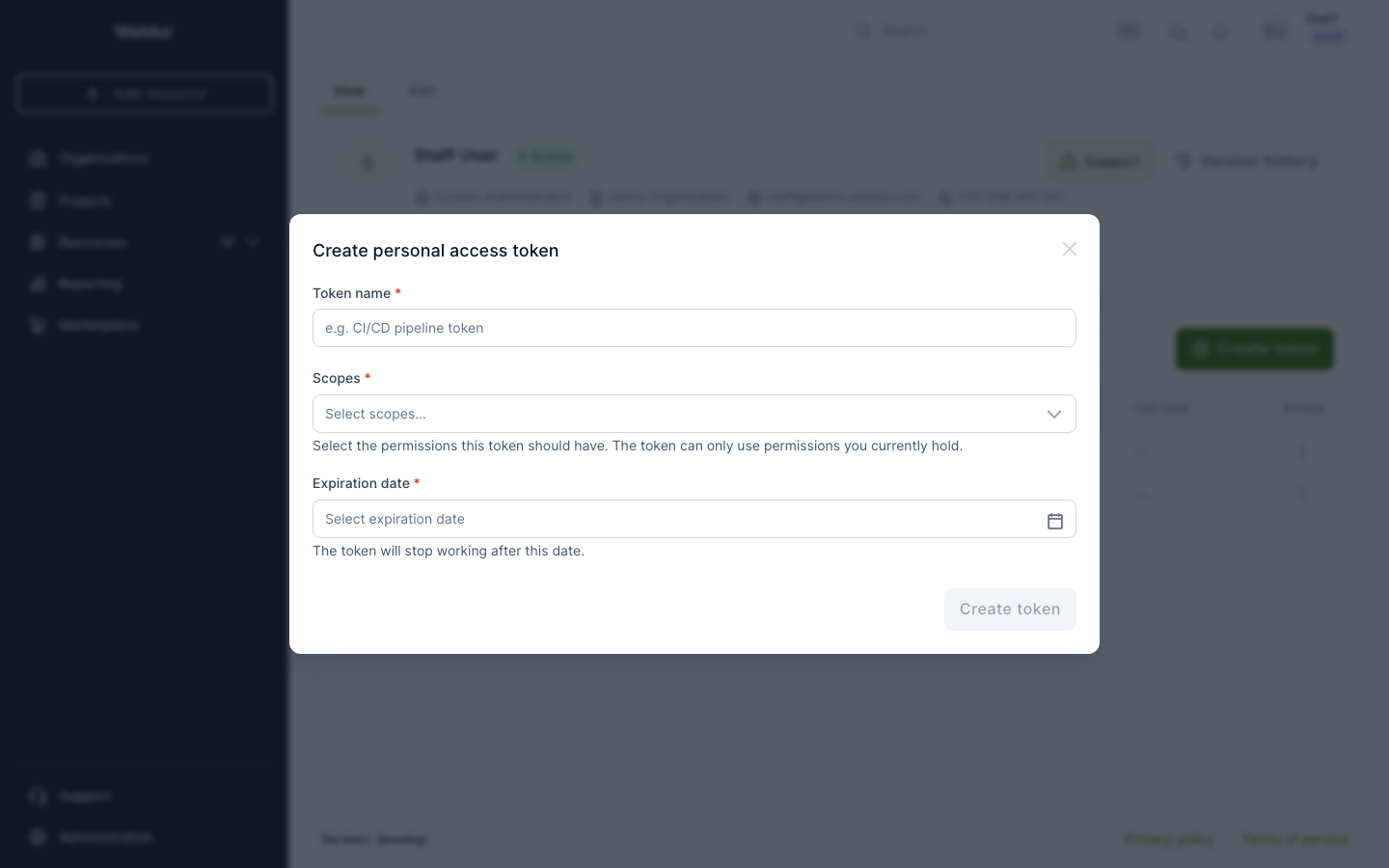 Personal access tokens (PATs) provide a secure way to authenticate with the Waldur API for programmatic access. Unlike session-based authentication, PATs are scoped, time-limited, and can be revoked independently.