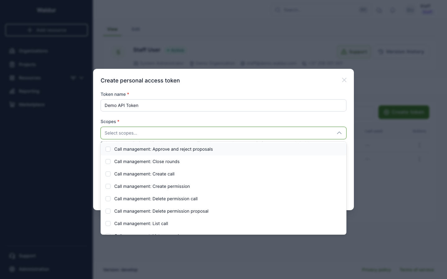 - Scopes — select the permissions this token should have. Only permissions you currently hold are available.