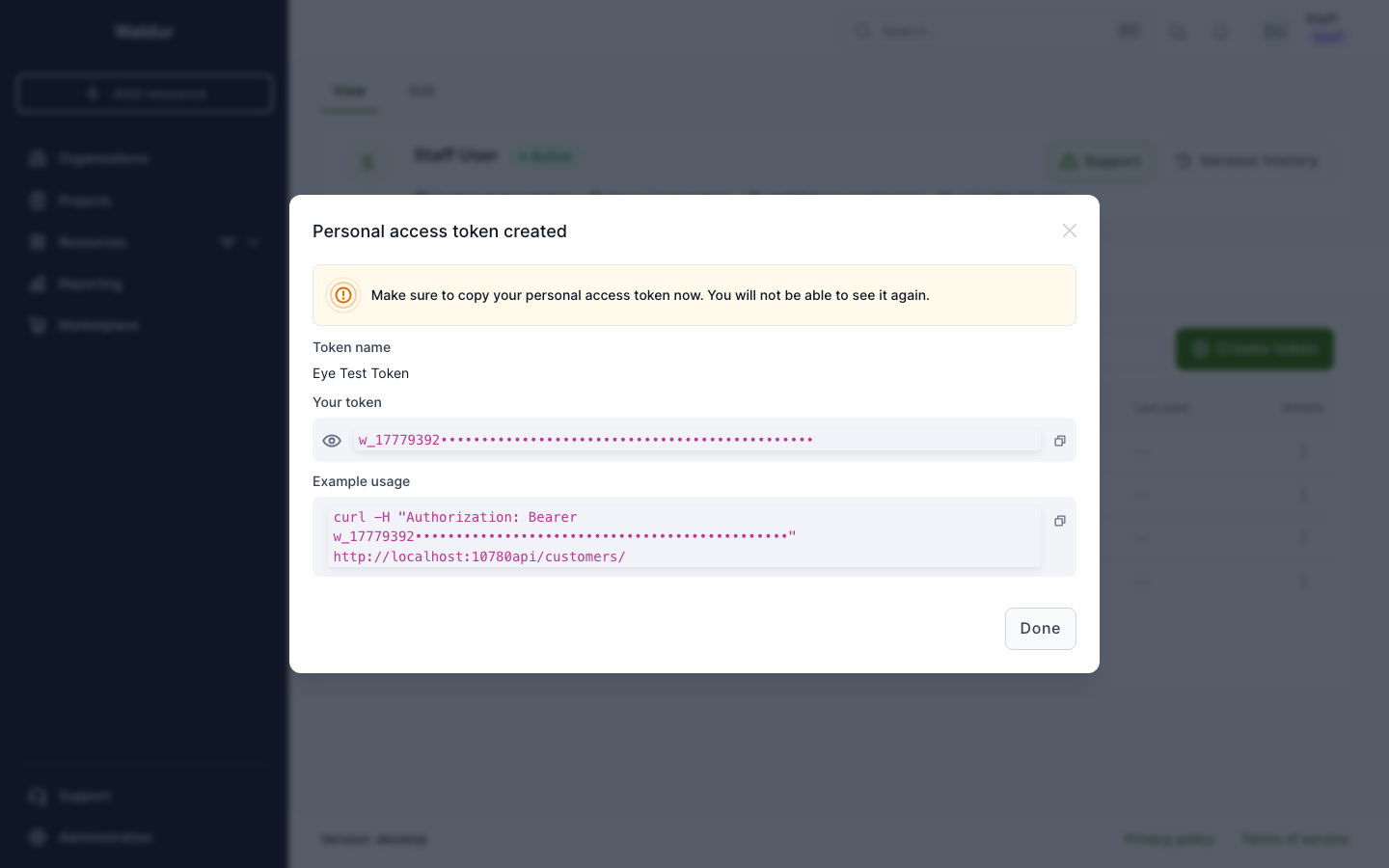 Copy your token immediately. It will not be shown again. Use the copy button or copy the curl example directly.