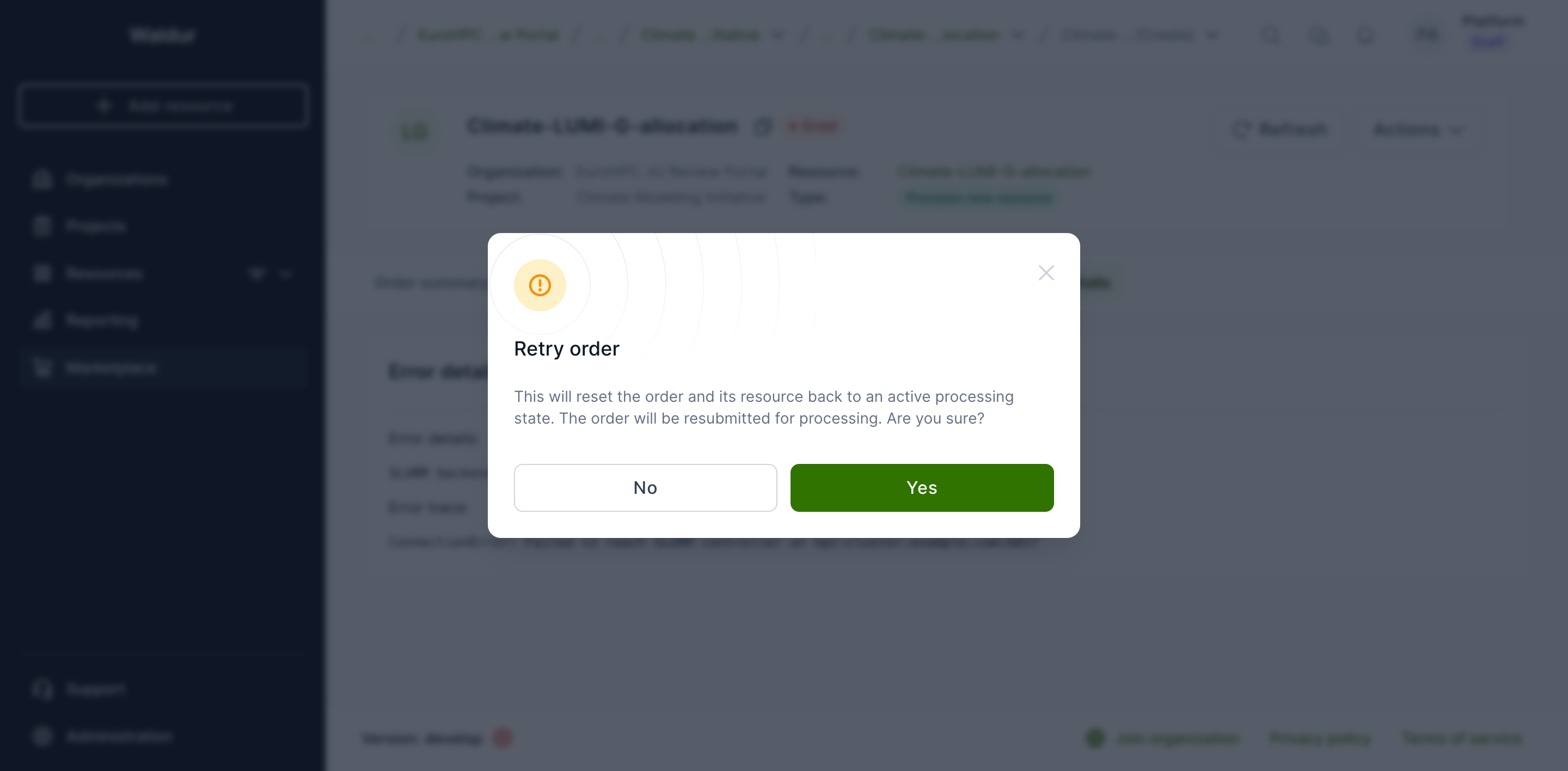 A confirmation dialog will appear explaining that the order and its resource will be reset to an active processing state. Click Yes to confirm.