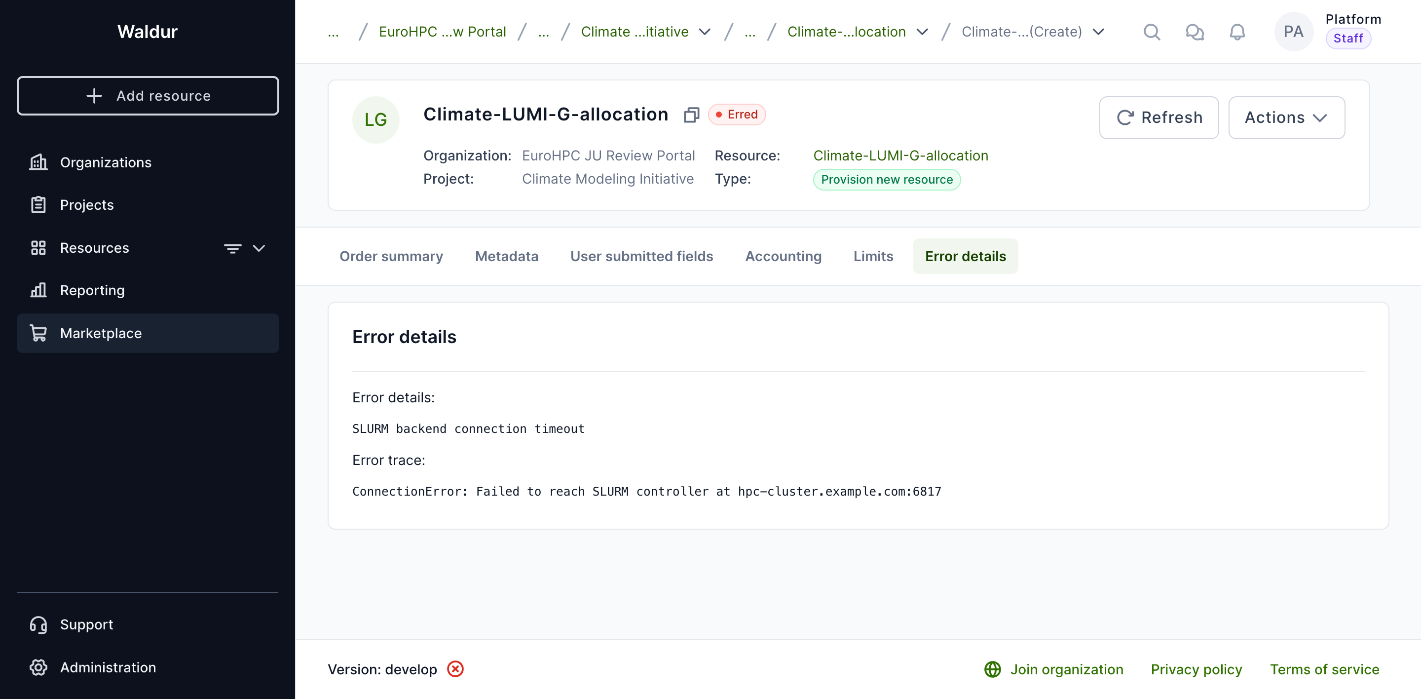 Navigate to the order details page. The order state will show as Erred with an error message describing what went wrong.