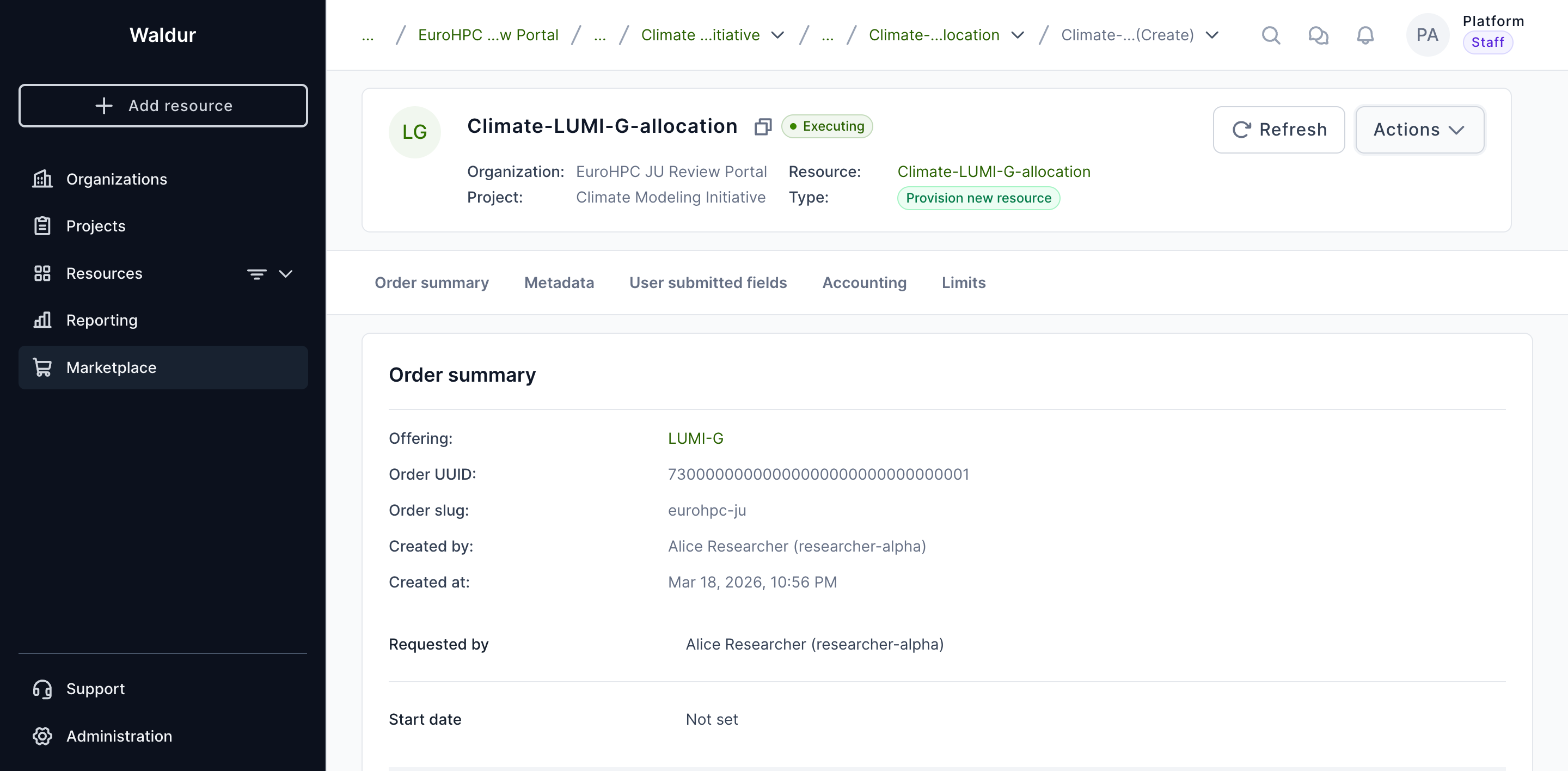 For offerings that are managed manually (Basic and SLURM offerings), you can mark an executing order as Done once the resource has been provisioned on the backend.
